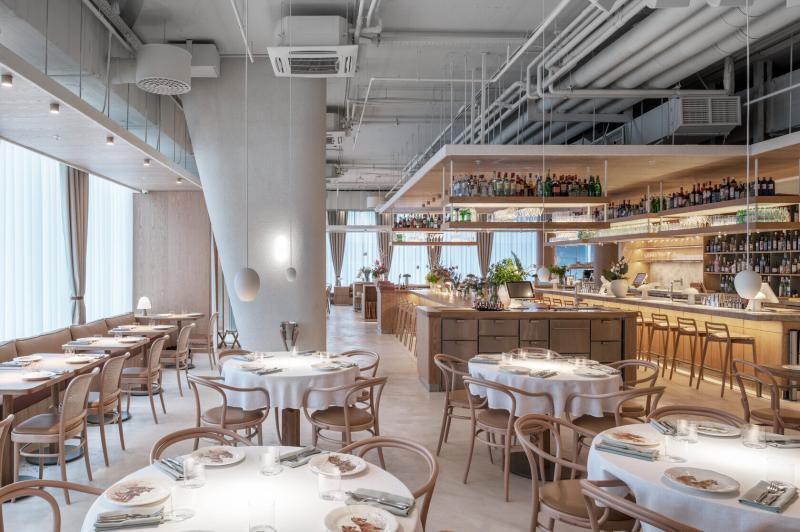 Ресторан предстал как камерный остров с сотней посадочных мест и отсылкой к петербургской гастрокультуре за счет схожести с другим проектом Дмитрия Блинова, рестораном Harvest. Прямо у входа гостей встречает длинный барный остров (bar table) из светлого дерева, один из самых больших в Москве. Этот эффектный элемент задает тон всему пространству, подчеркивая умиротворенную атмосферу для общения. Над баром возвышается элегантная конструкция подсветки, а на навесных полках аккуратно выстроены бутылки.