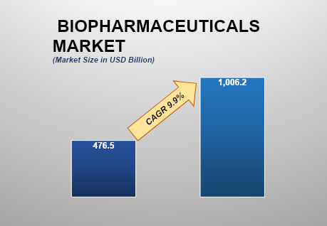 The Biopharmaceutical Market size is anticipated to experience substantial growth from 2025 to 2033, fuelled by increasing demand for targeted therapies, and advancements in biotechnology drive the biopharmaceutical market size. With an estimated valuation of approximately USD 476.5 billion in 2025, the market is expected to reach USD 1,006.2 billion by 2033, registering a robust compound annual growth rate (CAGR) of 9.9% over the decade.
