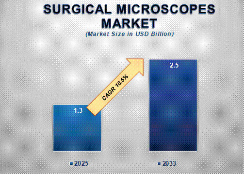 The Global Surgical Microscopes Market is projected to reach a market size of USD 2.5 billion by 2033, up from USD 1.3 billion in 2025, growing at a robust CAGR of 9.0% during the forecast period. Surgical microscopes are high-precision optical instruments widely used in microsurgeries to provide high-resolution, magnified, and illuminated views of the surgical area, enabling enhanced accuracy and better clinical outcomes. The market is witnessing strong growth due to increasing demand for minimally invasive surgeries (MIS), advancements in healthcare infrastructure, and rising adoption of technologically advanced surgical equipment across hospitals and ambulatory surgical centers.