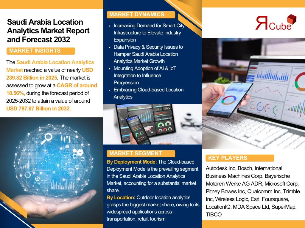 The Report Cube which is one of the leading market research company in UAE expects the Saudi Arabia Location Analytics Market to grow at a CAGR of around 18.56% through 2032, as highlighted in their latest research report. The study provides an in-depth analysis of the emerging trends shaping the Saudi Arabia Location Analytics Market and offers detailed forecasts for its potential growth during 2025–2032. The report also presents a comprehensive assessment of the competitive landscape, including profiles of leading players, their performance metrics, and recent strategic developments. Additionally, it explores the key market drivers, challenges, opportunities, and provides insights into historical and future revenue trends at the global, regional, and country levels.