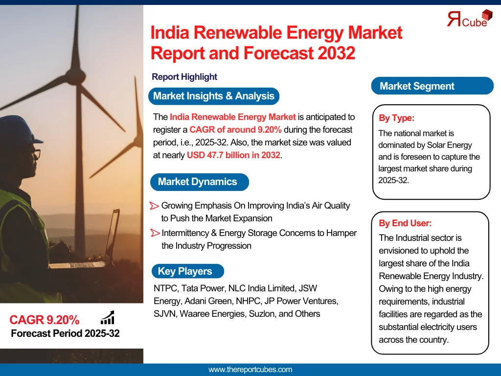 The Report Cube which is one of the leading market research company in UAE expects the India Renewable Energy Market to grow at a CAGR of around 9.20% through 2032, as highlighted in their latest research report. The study provides an in-depth analysis of the emerging trends shaping the India Renewable Energy Market and offers detailed forecasts for its potential growth during 2025–2032. The report also presents a comprehensive assessment of the competitive landscape, including profiles of leading players, their performance metrics, and recent strategic developments. Additionally, it explores the key market drivers, challenges, opportunities, and provides insights into historical and future revenue trends at the global, regional, and country levels.